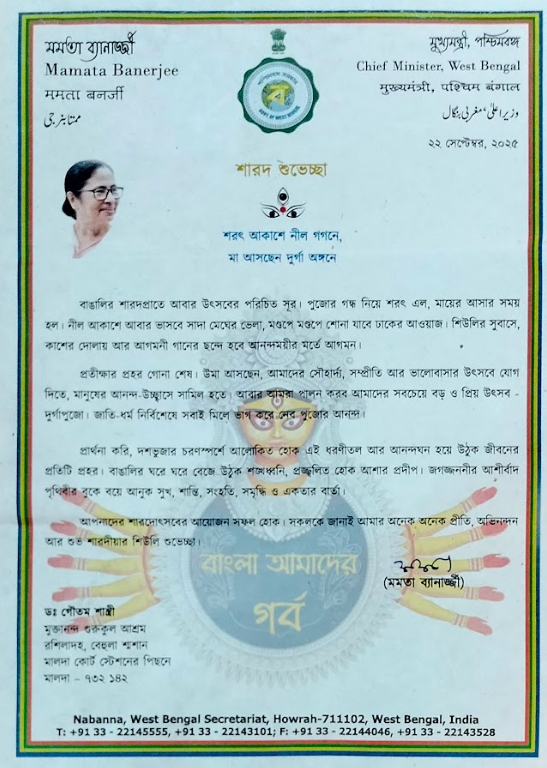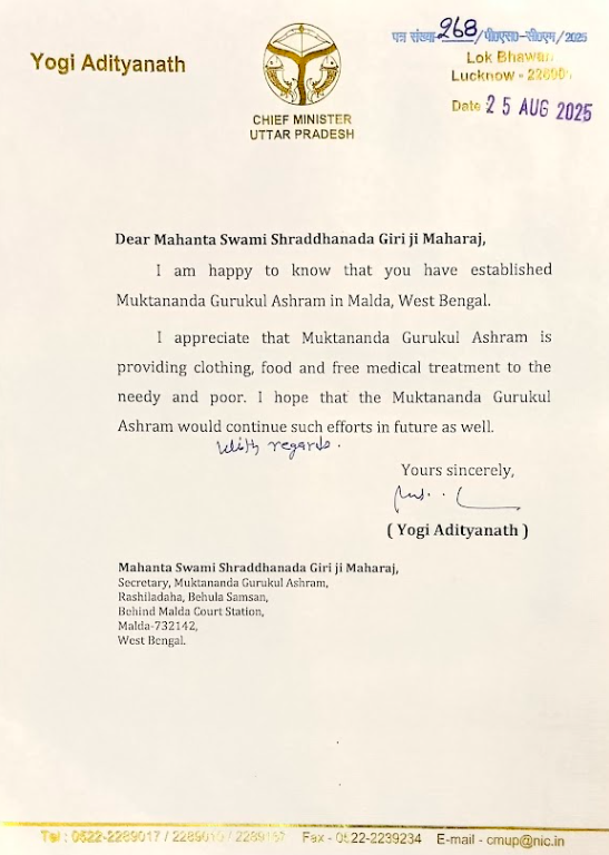 Letters of appreciation and goodwill received from Shri Yogi Adityanath, Hon’ble Chief Minister of Uttar Pradesh, and Smt. Mamata Banerjee, Hon’ble Chief Minister of West Bengal, acknowledging the spiritual, social, and humanitarian service of Muktananda Gurukul Ashram.